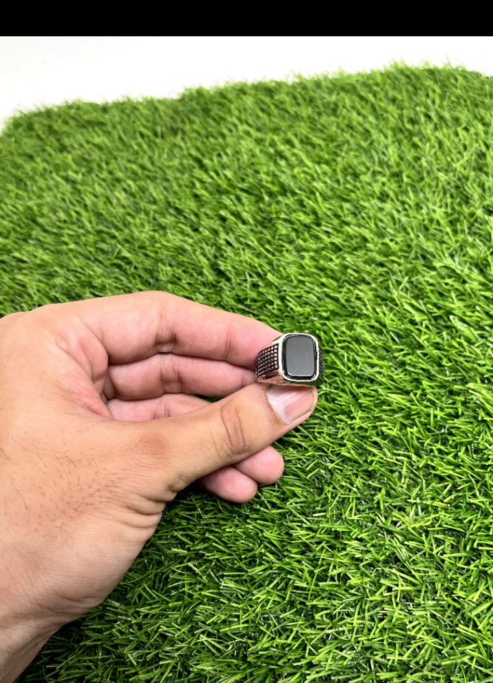 The men's ring features a bold, rectangular black onyx stone 🖤 with a detailed, textured band — exuding power and sophistication. 💪